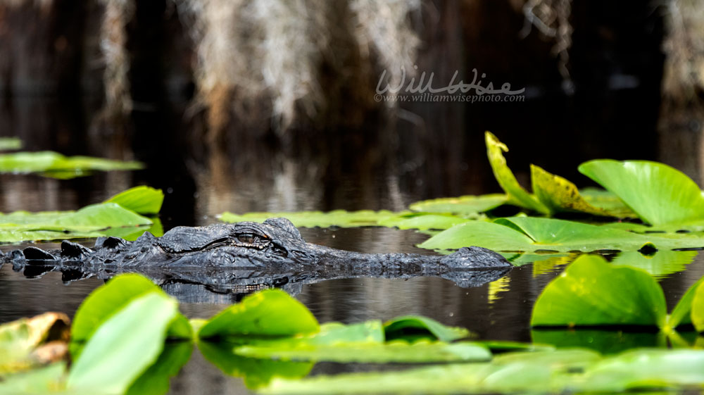 American Alligator swimming submerged in dark blackwater cypress swamp with spatterdock lily pads and Spanish Moss. Photographed March 11, 2020 in the Okefenokee Swamp National Wildlife Refuge, Georgia, USA. ©www.williamwisephoto.com. Please don’t steal my images. Download and use legally at Dreamstime.com.