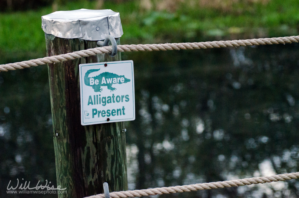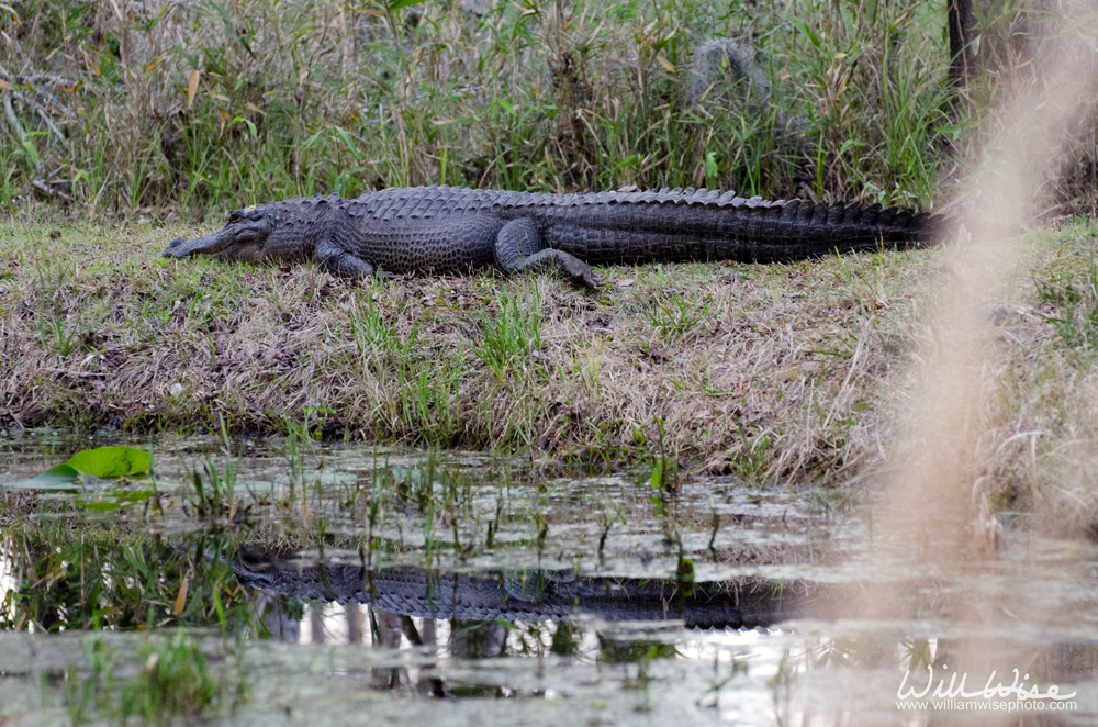Tuesday, 6:35 PM – As the fading light of dusk was about to force us to our tent site, a couple walking up the road said, “There is a gator behind the boat barn. But be careful; he’s out of the water and he is biiiiigggg.” We walked the quarter mile to the end of the cul-de-sac and past the bold “Be Aware Alligators Present” sign. We looked around the left side of the shed; nothing. As we came around the right… “Whoa! That is a big one!” He was sprawled out on the grass with his feet facing upwards. He must have fallen asleep sunning himself, for the sun had gone down an hour ago. He was turned away from us, so we snuck up close behind him. There was no sign of movement, not even of breathing. Wondering if he was dead, I felt the temptation to grab the end of his tail, but figured that was the kind of thing that gets one in the news.