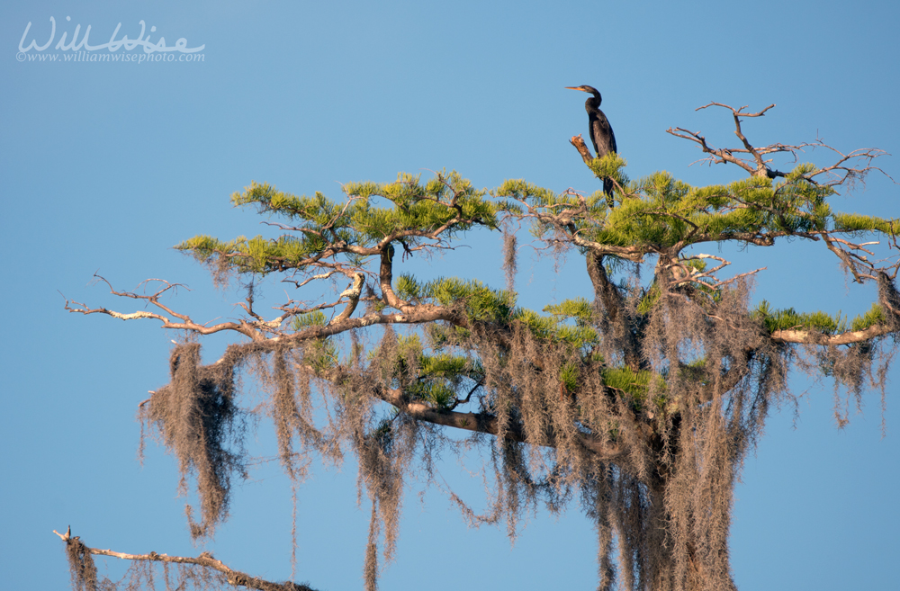 Anhinga bird perched atop a large Pond Cypress tree with Spanish Moss. Billy`s Lake on the Suwannee River canoe kayak trail. Okefenokee Swamp National Wildlife Refuge in Georgia, USA. Photographed May 2020.