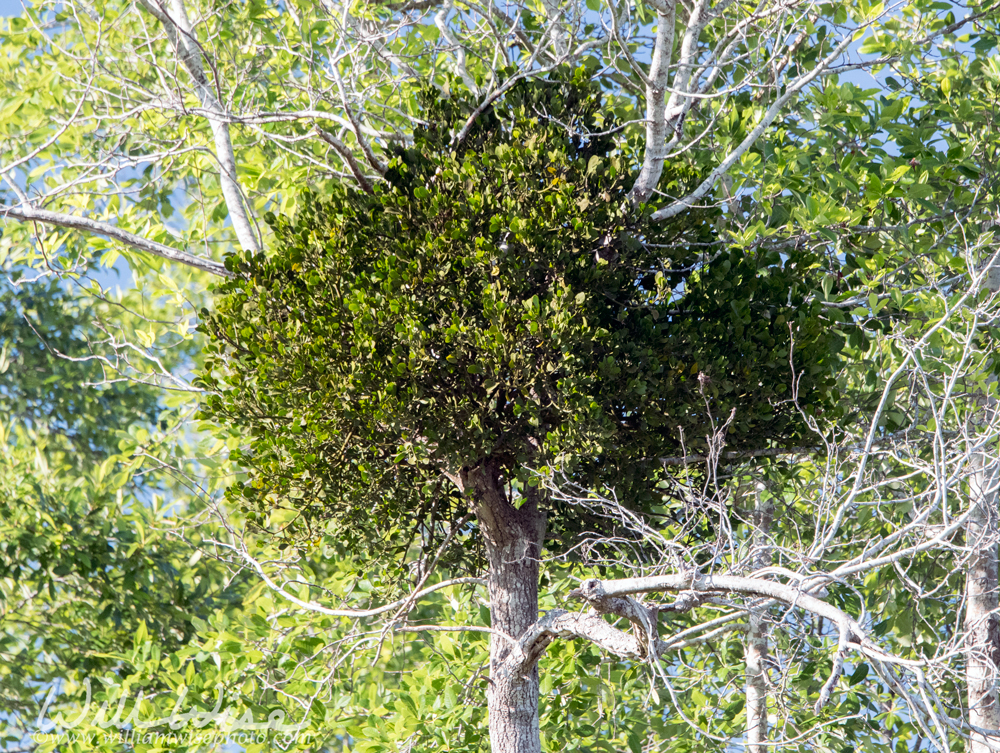 A large clump of thick green leaves sits high in otherwise bare tree. The thick glossy leaves growing are completely unlike the normal foliage furled out by that tree in the spring. This makes Mistletoe easy to spot, especially in the winter. Its parasitic nature – stealing water and nutrients from its host – is what earned phoradendron (literally, tree thief) its scientific name.