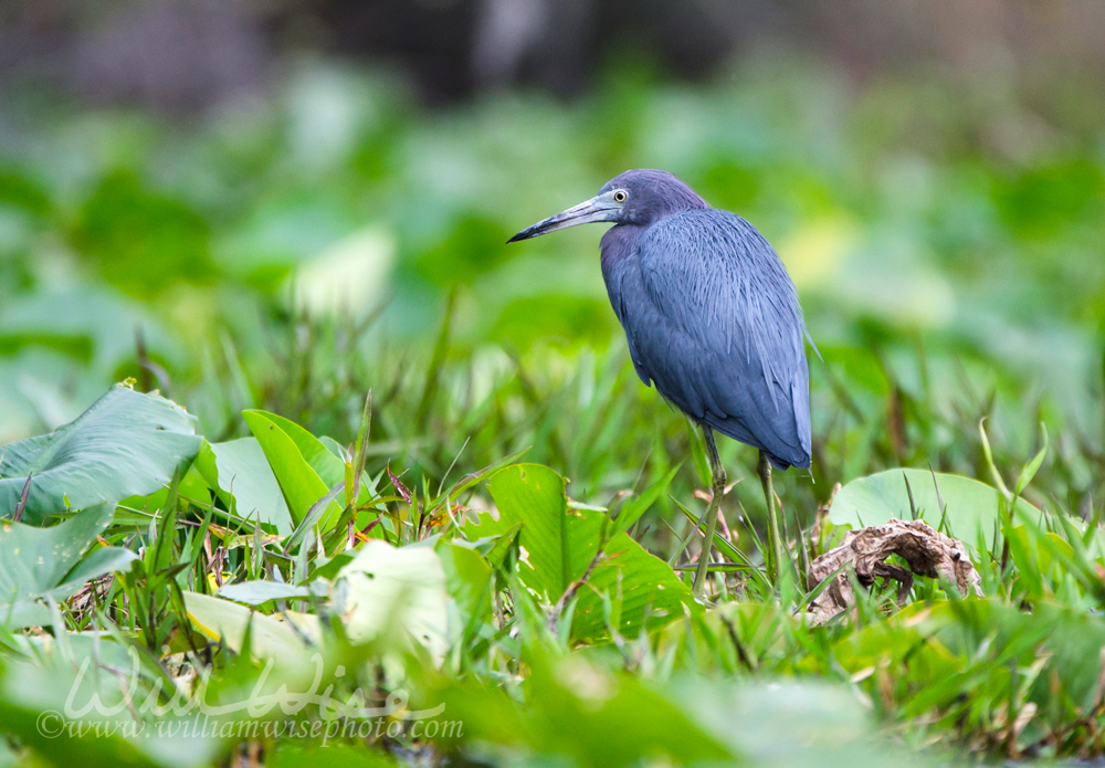 Monday, 9:25 AM – Frustrated by my pursuit of a quality Wood Duck photograph, we continued our travel along the edges of Billy’s Lake. We began a “leap frog” chase of a pretty Little Blue Heron. It was bold, but cautious. Standing on the Spatterdock, we’d pull in close and get a few shots. He then took to the sky, but landing again only about 75 feet away. We’d pull in close, get a few shots, and he’d move down again. The chase was fun and allowed some good shots on different backdrops.