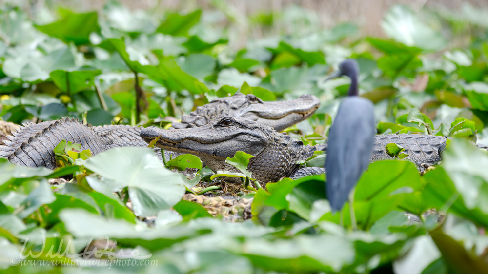 Our desire was to reach Big Water, a lake several miles up the Suwannee Middle Fork (red trail). To cover the ground, I was paddling rather quickly… probably too quickly to enjoy the Okefenokee. Just past 11:00 AM we entered upon Minnie’s Lake and grasped by sheer delight we slowed down. This area is such a beautiful sight, all you imagine of a pristine swamp scene: black waters reflecting Cypress knees, Spanish Moss and blue sky. As it opens up on the lake, the canoe trail widens and is lined by large, green lily pads of Spatterdock and White Water Lily. Stumps and fallen logs rise above the water and vegetation, each occupied by a sunning turtle or basking alligator. Just past the rest area platform lay some large gators, basking in groups of three and four. A brave Little Blue Heron fished right alongside three monsters. Minnie’s lake is a place to slow down and enjoy, not hurriedly paddle through.