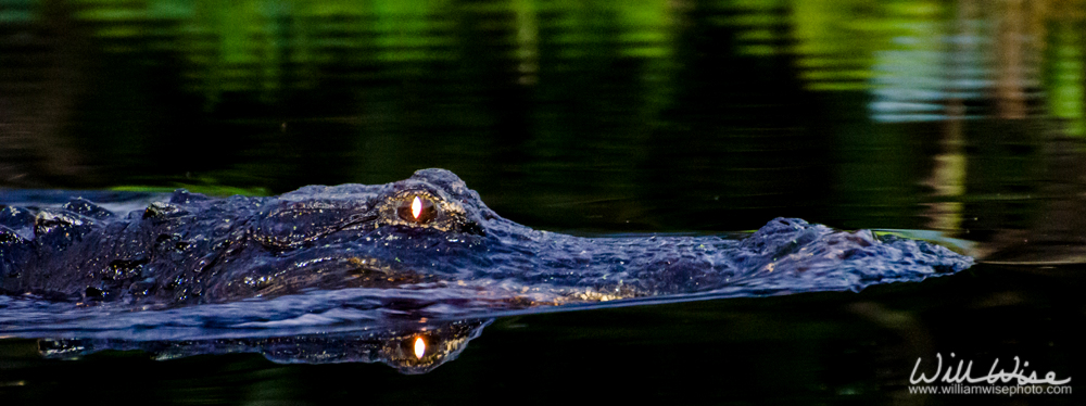 Alligator red-eye shine swimming in the dark Okefenokee Swamp at night. March 10, 2015 Stephen C Foster State Park; Okefenokee National Wildlife Refuge, Georgia. ©www.williamwisephoto.com.
