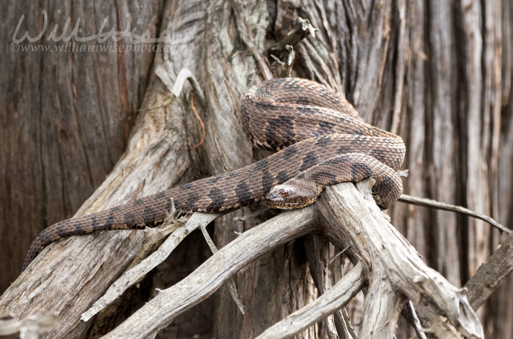 “Seeing this malformed forest in the strange green light, one might expect it to be the home of gnomes, with beards and humps. As a matter of fact, it is inhabited by much more sinister personalities. The bays are the favorite haunts of the cottonmouths and other water snakes, which lie coiled contentedly on the cypress knees, or crawl into the bushes along the runs to sun themselves. Often they drop into the boats of the swamp folk as they pole beneath them. While the terrified boatman looks on in horror, the snake raises its menacing head, hisses angrily, and then – if this is the boatman’s lucky day – glides slowly over the side into the water. Full-grown cottonmouths are four or five, and rarely six, feet long, a dull olive brown in color and not more than nine inches in circumference. Sometimes great masses of snakes, the harmless, brightly colored ones looped with the poisonous moccasins, are twined around dead limbs overhanging the runs.”